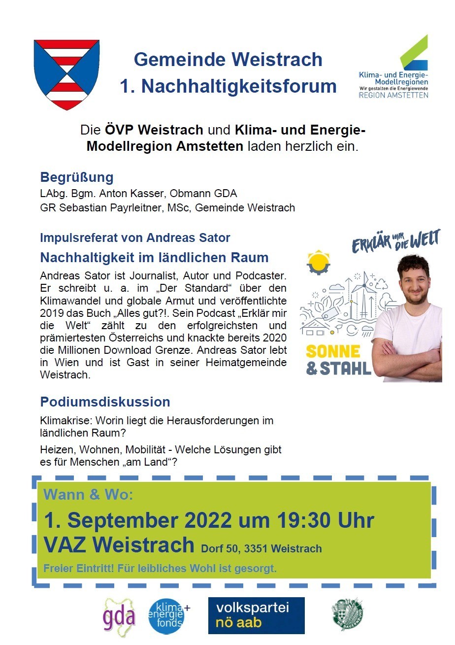 Andreas Sator, Journalist, Nummer-1 Podcaster Österreichs & Ö3 Podcast Award 2021 Winner, ist zu Gast in seiner Heimatgemeinde Weistrach, um über Nachhaltigkeit und den ländlichen Raum zu sprechenDie ÖVP Weistrach und GDA Amstetten lädt Sie herzlich zum Nachhaltigkeits-Impulsvortrag in Weistrach ein.