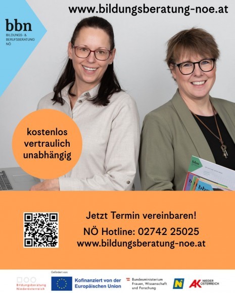 Die Bildungsberatung NÖ berät zu den Themen: Berufliche Orientierung Berufe Aus- und Weiterbildung Finanzielle Fördermöglichkeiten Aus- und Weiterbildung Finanzielle Fördermöglichkeiten Vereinbaren Sie Ihren persönlichen Beratungstermin bei den Bildungsberaterinnen Bettina Lanzenberger und Silvia Wagner! Tel.: 0676/88 044 390 oder 0699/12 20 66 22 oder buchen Sie gleich online: www.bildungsberatung-noe.atkostenlos. vertraulich. unverbindlich.