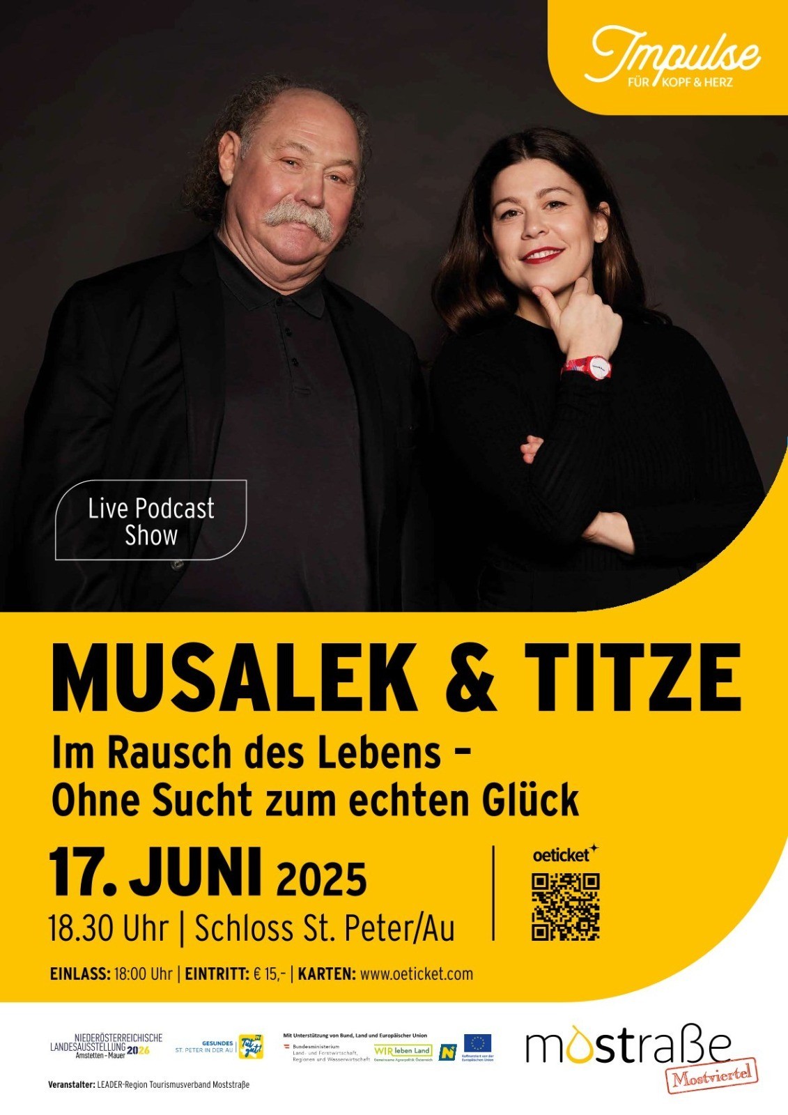 Am 17. Juni 2025 macht die erfolgreiche Live-Podcast-Show von Dr. Alfred U. Musalek und Claudia Titze Halt im Schloss St. Peter/Au. Beginn ist um 18:30 Uhr, Einlass ab 18:00 Uhr.