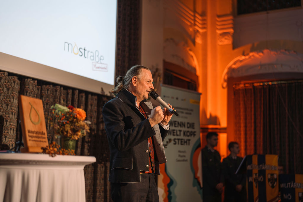 Die Veranstaltung, musikalisch umrahmt von der Militärmusik Niederösterreich, stand ganz im Zeichen der Wertschätzung und des Zusammenhalts in der Region. Im Mittelpunkt standen 37 Moststraße-Mitgliedsbetriebe, die durch ihre Teilnahme am Programm einen aktiven Beitrag zur Vorbereitung auf die Niederösterreichische Landesausstellung 2026 unter dem Titel „Wenn die Welt Kopf steht“ leisten. Von April bis Oktober 2025 nahmen die Betriebe an über 20 Kursen, Workshops und Exkursionen teil. In Basis- und Vertiefungsmodulen wurden Themen wie Kulturvermittlung, Natur und Nachhaltigkeit, Zielgruppenarbeit, Kommunikation & Storytelling sowie Ästhetik und seelisches Wohlbefinden behandelt. Ergänzt wurde das Angebot durch Exkursionen, individuelle Beratungen und einer Betriebsfotografie.