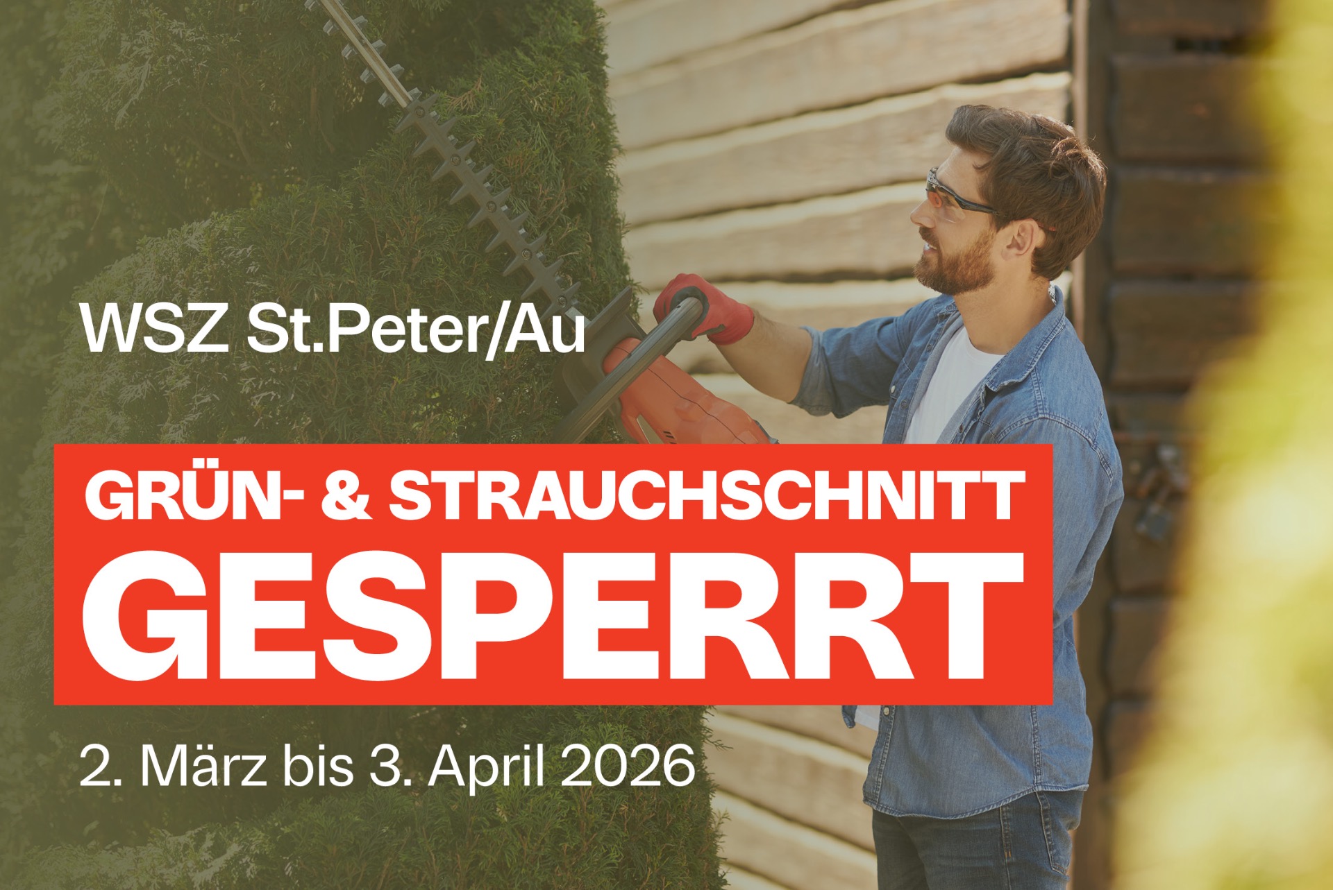 Der GDA informiert darüber, dass der Grün und Strauchschnittplatz beim WSZ St. Peter Au von 2. März bis voraussichtlich 3. April gesperrt ist. Grund dafür sind notwendige Bauarbeiten.